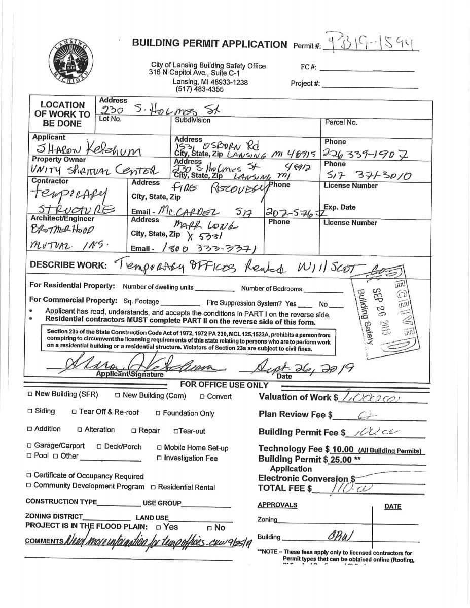 September 26th A Building permit was obtained for the trailer so that electrical and other services could be hooked up (Application for permit attached). Temporary offices became fully functional Oct. 4th.