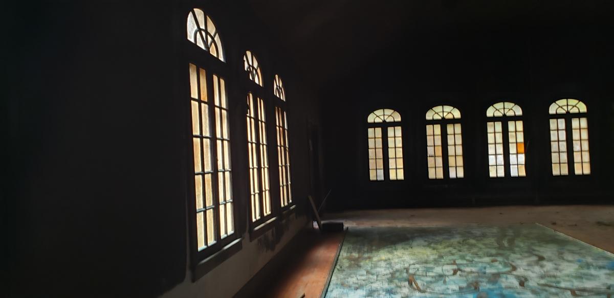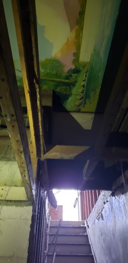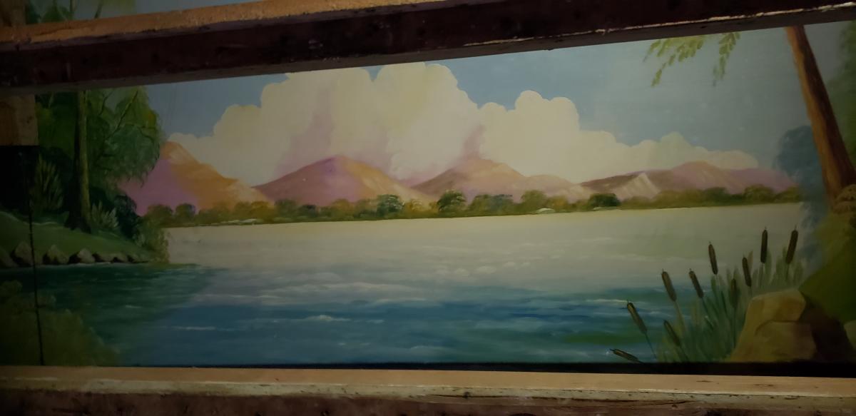 During the demolition of the inside of 230 S. Holmes, two surprises - the wall behind the podium was originally built with three arches and light inbetween. And on the lower level, outside of the women's bathroom, a painting was discovered in the ceiling. It looks like a painting on a 4X8 piece of wood was repurposed for flooring from another building.