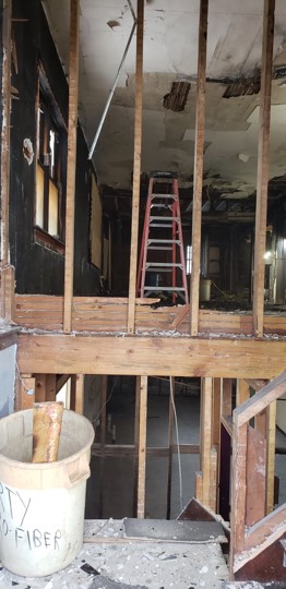 Monday, January 6th, there was a walkthrough of 230 S. Holmes to evaluate the remediation. The interior has beens sprayed with a sealer to contain and lingering smell. Some of the smell can not be contained until charred beams and windows are replaced during a restoration process. The areas impacted have been marked with red and black spray paint. For example, there is a space between the wood framing and the brick exterior in the administration office area. The wood framing will not come down until a restoration phase. Also, several support beams as well as the encasement around the windows still emit an odor. These items/areas will eventually be removed and replaced.