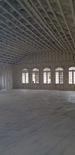 - Jerry Podany has done some repairs at the Fledge (handrailing, bathroom door lock, etc.) as well as installed the new safe at the trailer. WE also arranged to have the gas stove hooked up at the Fledge so it is fully functional Pictures: Sanctuary (blue on floor is anti-mold powder - all carpet has been removed.) Drum platform, Minister's office which can not be emptied until building is shored up for safety of crew, fellowship room, activity area outside of sanctuary and ceiling of kitchen.